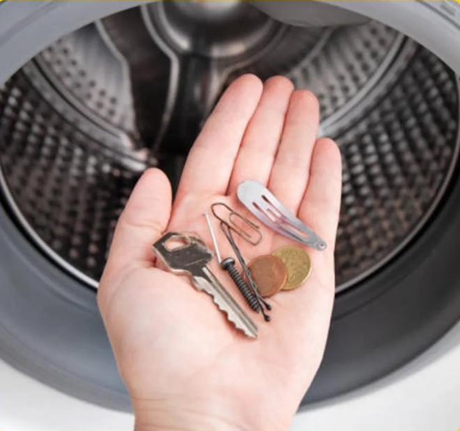 Đây là một trong những nguyên nhân phổ biến khiến máy giặt Electrolux bị rung khi vắt và phát ra tiếng ồn lớn. Khi các vật cứng như: Chìa khóa, đồng xu hoặc đá nhỏ bị sót trong túi quần áo, chúng sẽ va chạm vào lồng giặt khi máy quay ở tốc độ cao.